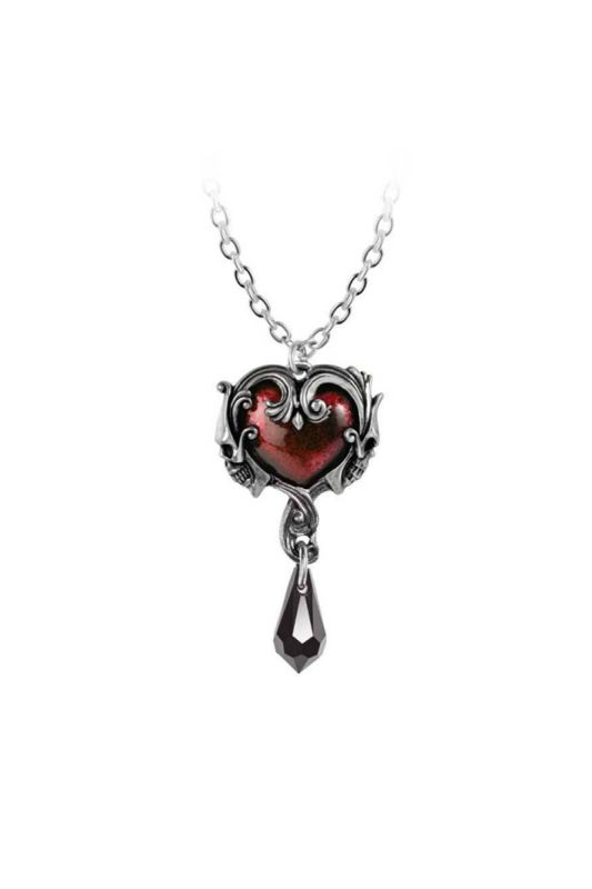Alchemy England Halskette um deinem Leben mehr Romantik zu verpassen. Vereinige dich mit deinen liebsten Kreaturen, auch wenn es nur Dämonen sind. Erlebe eine Romanze des Herzens, mit der Alchemy England "Petite Affair Du Coeur" Halskette. Sie ist eine Verlobung zwischen zwei seltsamen und exotischen Kreaturen von einem anderen Ort. Unter den Sternen des Nachthimmels und perfekt für den täglichen Gebrauch, wird diese Gothic Halskette dein Leben bereichern. Aus feinstem Zinn handgemacht in England, steht im Zentrum der Halskette ein zarter, aber auffälliger Anhänger. Der Herzanhänger aus Zinn ist in der Mitte in einem transparenten Rot emailliert und wird von einem barocken Rahmen aus antikisiertem Zinn mit einem Totenkopfprofil auf beiden Seiten umgeben. Mit viel Liebe zum Detail, ist diese Alchemy England Kette ein echtes Meisterwerk. Die feingliedrige Kette ist 82cm lang und ideal, um sie mit viktorianischen Outfits zu kombinieren. Der silberfarbene Anhänger ist 2cm x 5cm groß und wird dich ganz sicher zum Blickfang machen. Ideal um beim nächsten Gothic Festival ins Gespräch zu kommen. Kombiniere den wundervollen Gothic Schmuck zu allem, was dein schwarzes Herz verlangt. Diese Gothic Halskette wird deine Sehnsucht nach unsterblicher Liebe stillen.