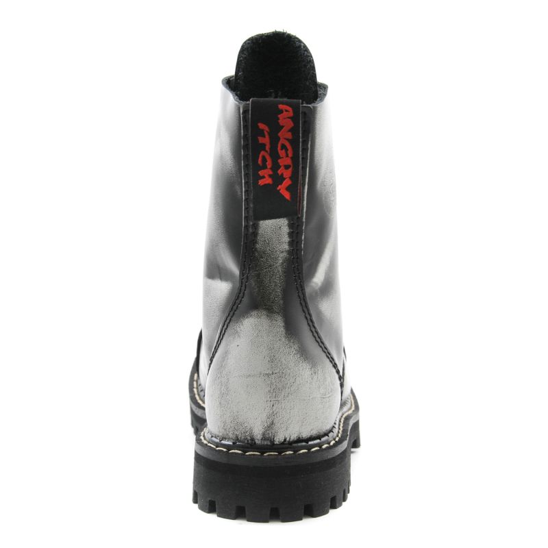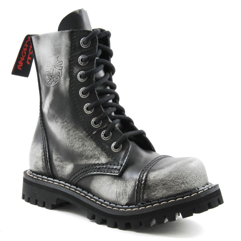 Die weißen 8 Loch Angry Itch Boots in Rub-Off-Optik sind der absolute Knaller und ein richtiger Blickfang. Das weiß wirkt sehr dunkel, so dass die Gothic-Boots ein bisschen dirty und anrüchig wirken.. Die Stahlkappe ist innen mit Filz ausgeschlagen und schützt so Deine Zehen optimal. Die sehr robuste Sohle der Army-Ranger hat ein tiefes Profil, was für allzeit sichen Stand sorgt. Ganz egal ob auf einem Festival oder in Deinem Alltag. Die weiche Innensohle ist waschbar und das Vollleder, aus dem die Gothic-Stiefel gefertigt sind, bieten den ausgesprochen hohen Tragekomfort. Auch diese Angry Itch Stiefel sind zu 100% in der EU hergestellt. Auf dem Schaft befindet sich das Logo eingeprägt ins Leder, sowie unter der Sohle und auf der Lasche am Schaft, welche Dir das Anziehen erleichtert wird.