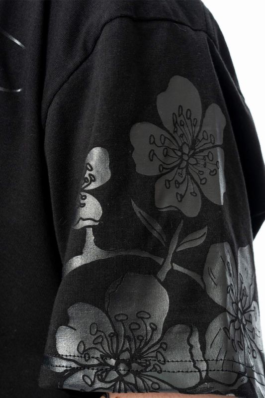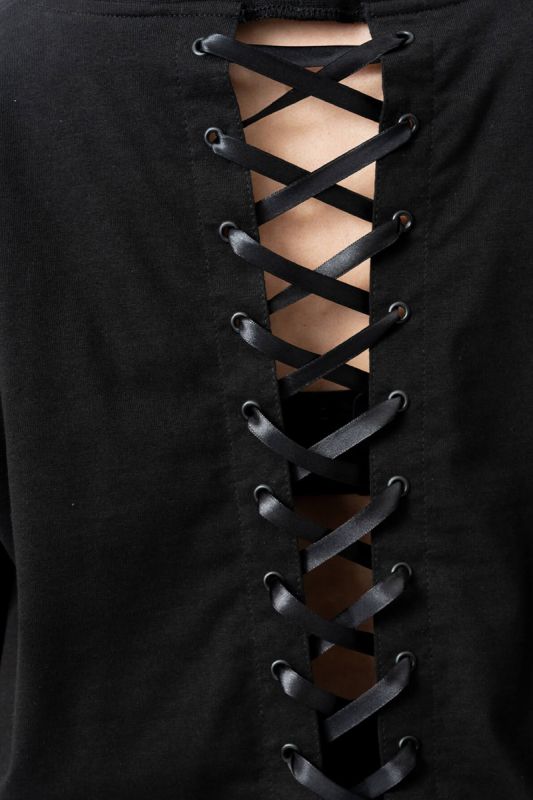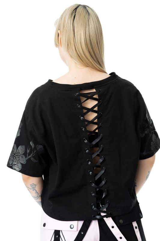 Der matte, grauschimmernde Frontprint wirkt wie ein abstraktes, tribalartiges Sigil und setzt einen starken Fokus auf das Oberteil. Florale Prints an den Ärmeln sorgen für einen soften Kontrast und verleihen dem Design eine geheimnisvolle Tiefe. Das Highlight: die durchgehende Rücken-Schnürung, die Haut zeigt und dem Shirt eine sinnliche Note gibt.