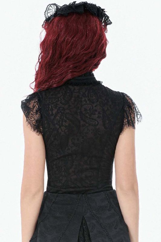 Die taillierte Passform, zarte Rüschen am Saum und die kurzen Spitzenärmel verleihen dem Shirt eine feminine, aristokratische Ausstrahlung – perfekt für Dark Romantic, Victorian Gothic oder elegante Witchwear-Looks.