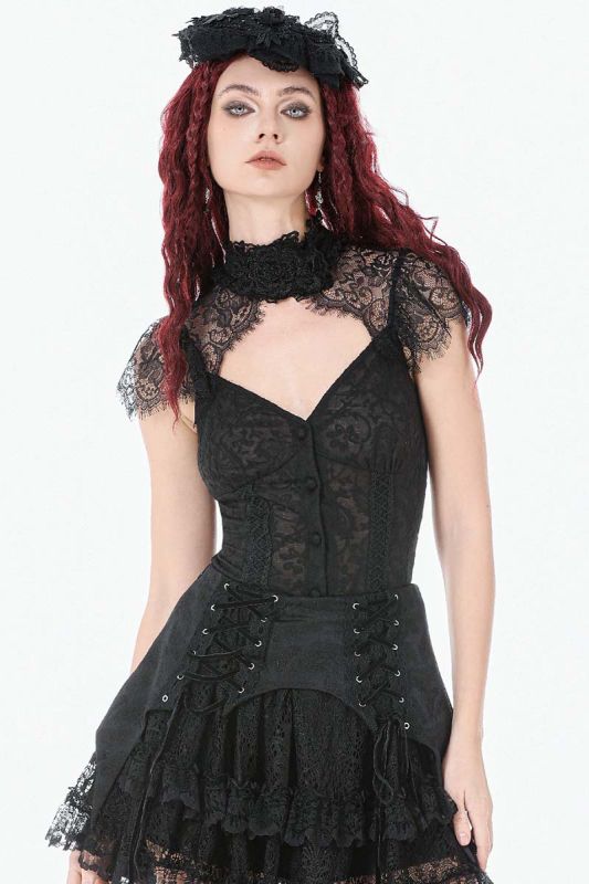 Die Evelyn Bluse von Dark In Love vereint viktorianische Eleganz mit moderner Gothic-Sinnlichkeit. Fein gearbeitete Spitze umhüllt den Körper wie ein dunkler Schleier und betont die Silhouette auf raffinierte Weise. Der hochgeschlossene Spitzenkragen mit Schlüsselloch-Ausschnitt setzt ein edles Statement, während das transparente Material einen verführerischen Kontrast zwischen Zurückhaltung und Offenbarung schafft.