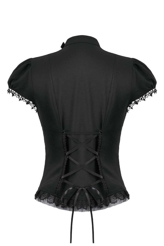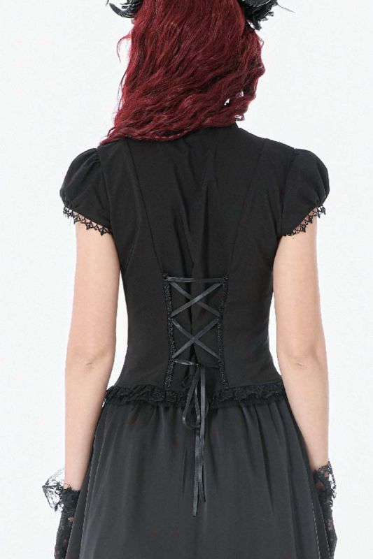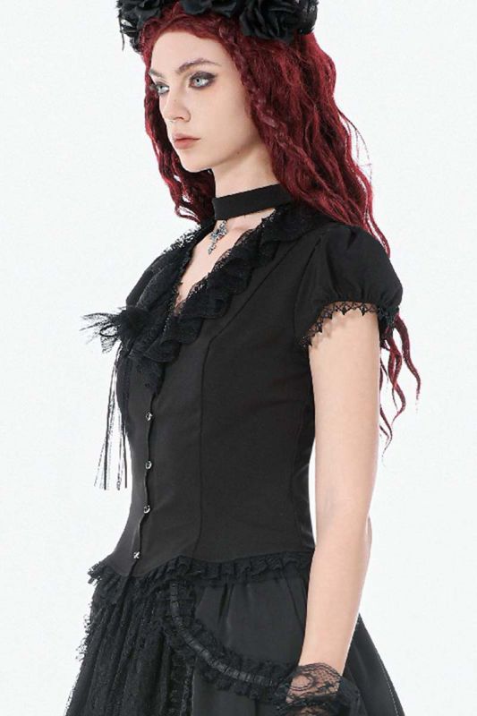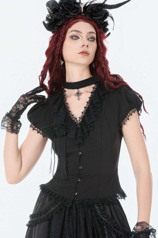 Diese elegante Gothic-Bluse von Dark In Love verbindet viktorianische Romantik mit einer klar definierten, femininen Silhouette. Der taillierte Schnitt wird durch eine rückseitige Schnürung im Korsett-Stil akzentuiert und betont wirkungsvoll die Taille. Zarte Spitzenabschlüsse, feine Rüschen und eine dekorative Stoffrose im Brustbereich verleihen dem Design eine melancholisch-edle Ausstrahlung. Der tiefe V-Ausschnitt mit Spitzenbesatz und das integrierte Choker-Element mit Kreuzanhänger machen die Bluse zu einem ausdrucksstarken Statement für Dark-Romantic- und Gothic-Looks.