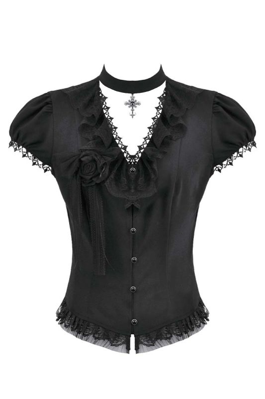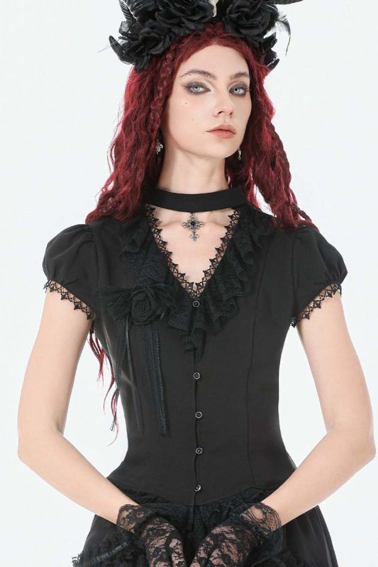 Dark In Love Mourning Rose Bluse mit Zierrose aus Stoff und integriertem Halsband