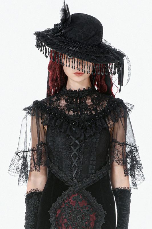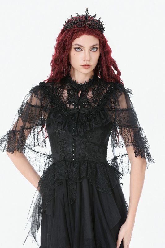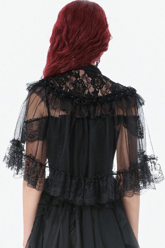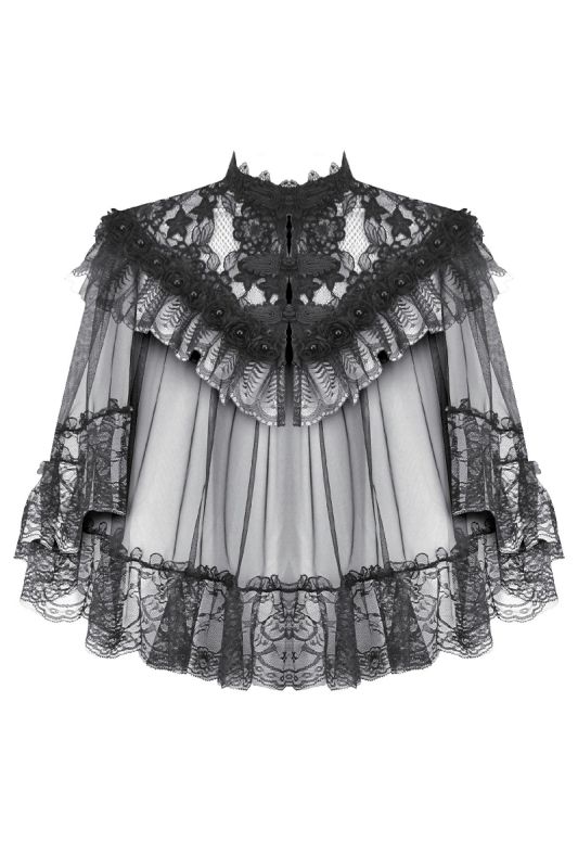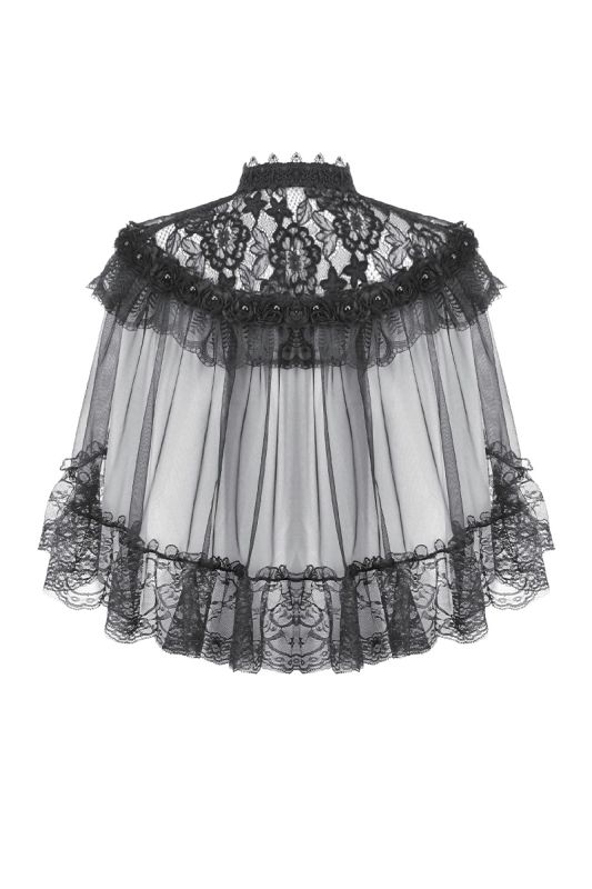 Dieses fein gearbeitete Spitzen-Cape von Dark In Love verleiht jedem Gothic-Outfit eine erhabene, beinahe königliche Aura. Inspiriert von viktorianischer Mode und historischer Hofkleidung, umhüllt es Schultern und Dekolleté mit transparenter Spitze, floralen Ornamenten und zarten Rüschen. Die detailreiche Verarbeitung macht das Cape zu einem ausdrucksstarken Statement-Piece für besondere Anlässe oder als stilvolle Ergänzung zu Kleidern und Korsetts im Alltag.