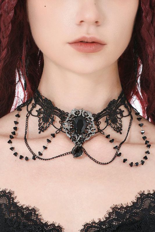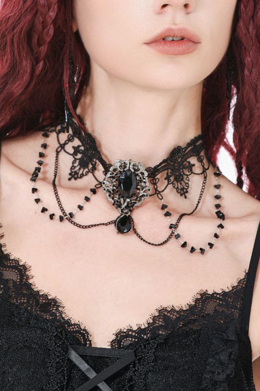Dieses kunstvoll gearbeitete Gothic-Halsband von Dark In Love vereint filigrane Spitze mit dramatischen Schmuckdetails zu einem ausdrucksstarken Statement-Piece. Zarte Spitzenornamente schmiegen sich elegant an den Hals, während der zentrale schwarze Zierstein in ornamentaler Fassung den Blick fesselt. Fein schwingende Ketten und schwarze Perlen verleihen dem Design Tiefe und eine verführerisch-viktorianische Aura – perfekt für Dark Romantic, Gothic Lolita oder elegante Abendlooks.