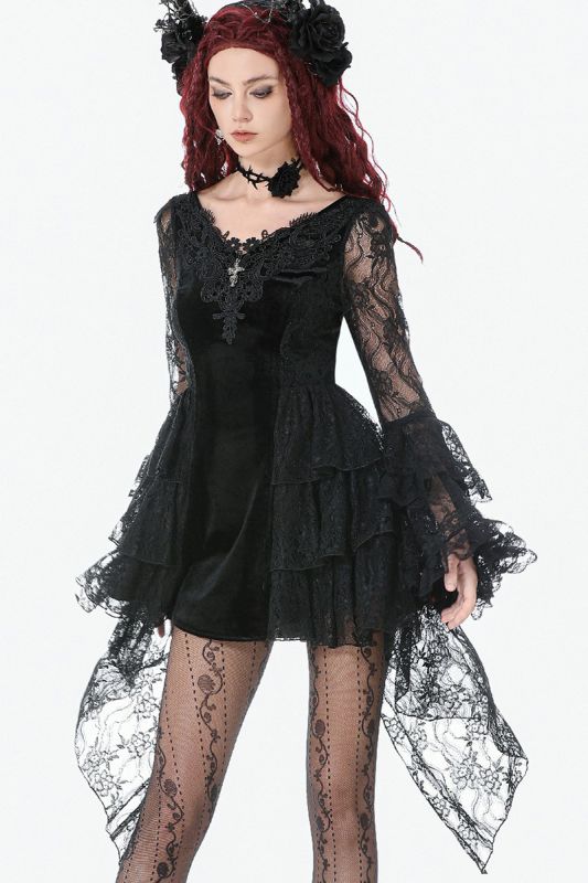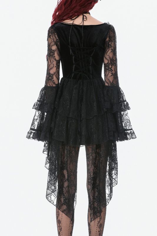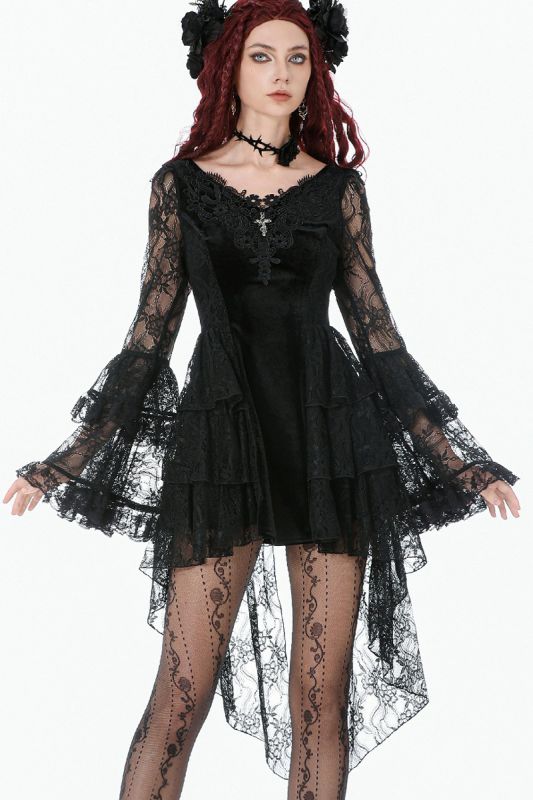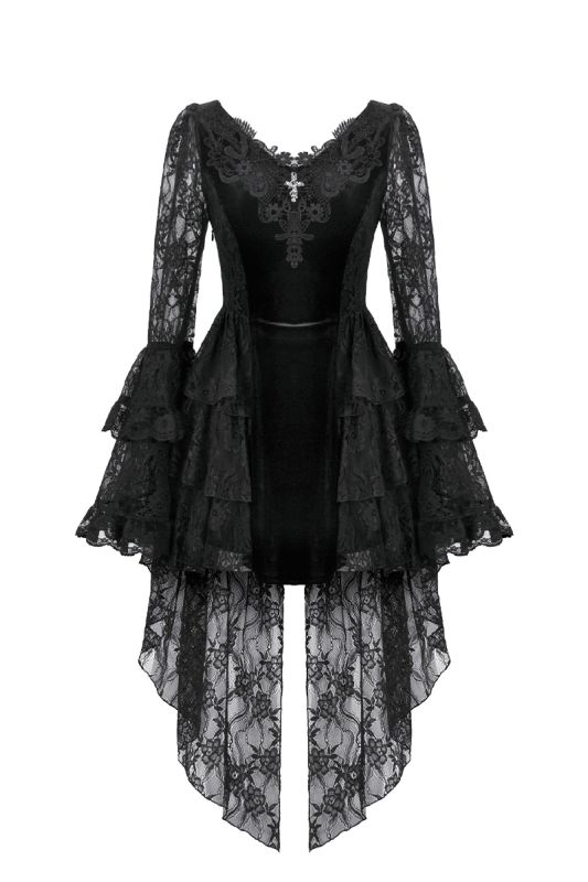 Die detailreichen Trompetenärmel aus Spitze, das geschnürte Rückenteil und das ornamental verzierte Dekolleté verleihen dem Kleid eine erhabene Ausstrahlung. Ein Statement-Piece für Gothic-Events, Dark Romantic Looks oder besondere Nächte jenseits der Zeit.