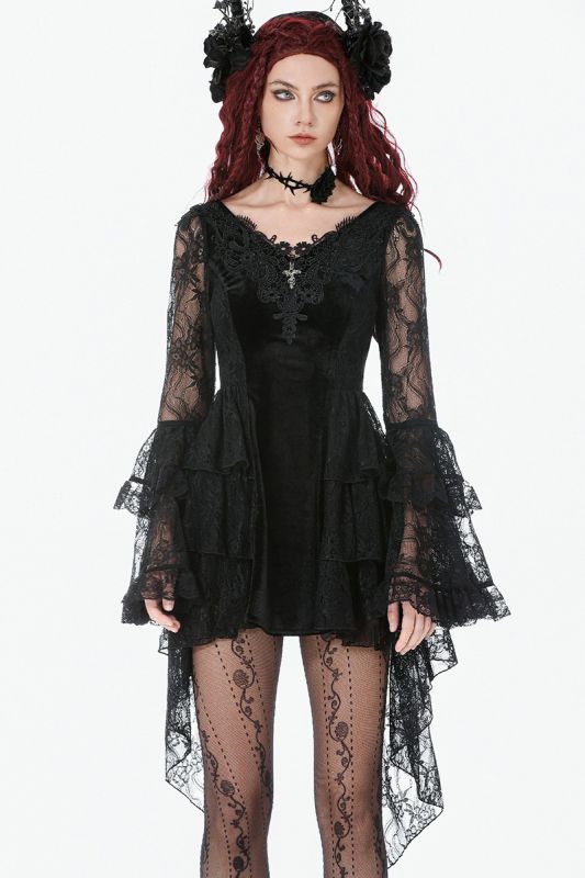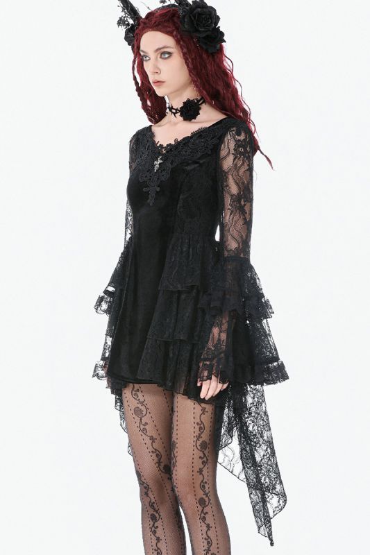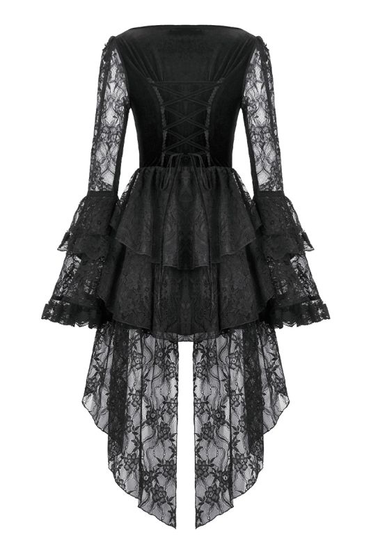 Dieses außergewöhnliche Gothic-Kleid von Dark In Love vereint höfische Anmut mit düster-romantischer Dramatik. Inspiriert von historischen Silhouetten und viktorianischer Trauerästhetik, entfaltet es eine eindrucksvolle Präsenz aus tiefschwarzem Samt und filigraner Spitze. Der figurbetonte Oberkörper geht in einen raffiniert gestuften Rock mit transparentem Spitzen-Fall über – vorne kürzer, hinten dramatisch verlängert.