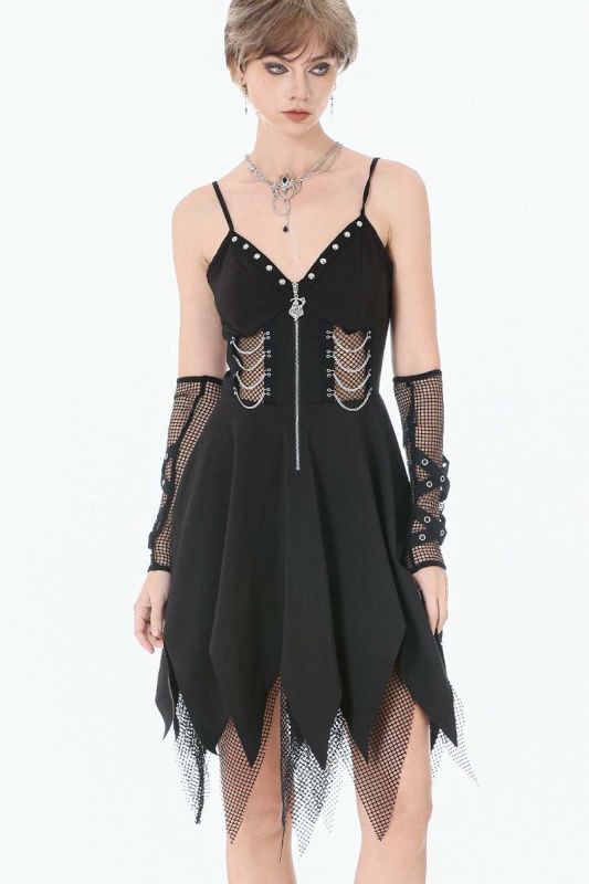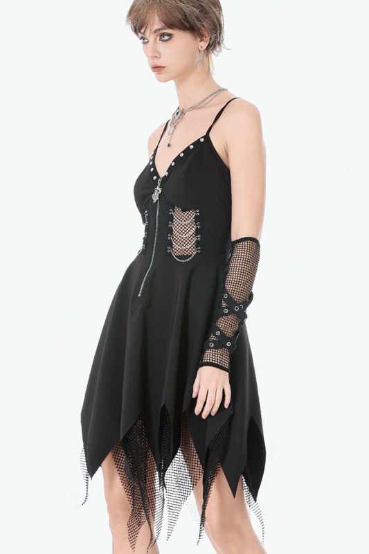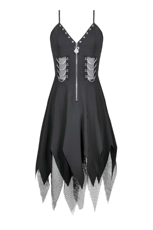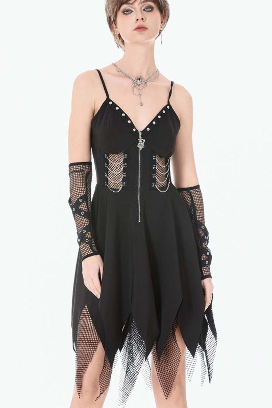 Roh, rebellisch und kompromisslos: Lilith Ashbourne ist ein Gothic-Kleid von Dark In Love mit deutlicher Punk-Attitüde. Klare Linien treffen auf aggressive Details wie Reißverschluss, Netzeinsätze und gezackte Saumkanten. Dieses Kleid ist kein romantisches Versprechen – es ist ein Statement. Es setzt auf eine markante, körpernahe Silhouette. Das Oberteil ist korsagenartig geschnitten und wird von einem silberfarbenen Front-Reißverschluss dominiert, der den Look bewusst industriell wirken lässt. Seitliche Netzeinsätze mit Metallösen und Ketten-Details betonen die Taille und sorgen für eine harte, urbane Note.
