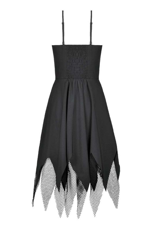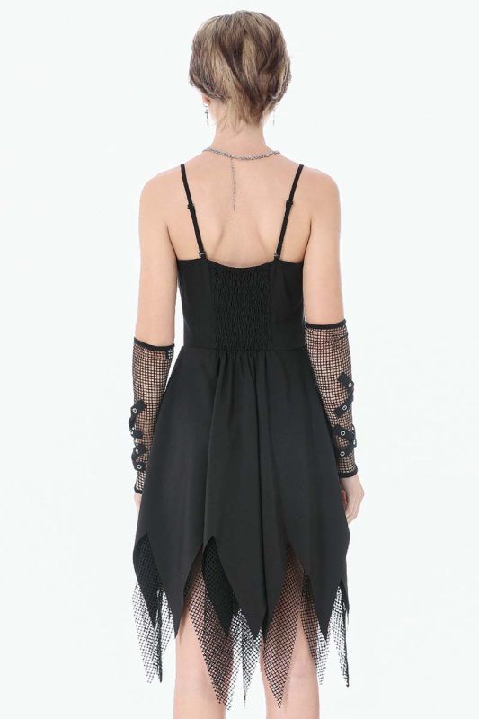 Der Rock fällt locker und endet in einer asymmetrischen, zackigen Saumlinie, ergänzt durch grobes Netzmaterial, das dem Kleid Bewegung und visuelle Tiefe verleiht. Die schmalen Träger und die elastische Rückseite sorgen für Halt und Tragekomfort.