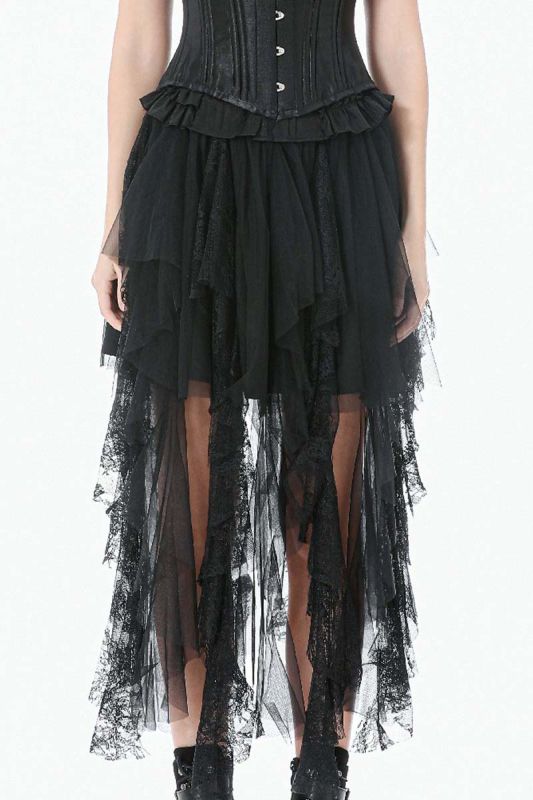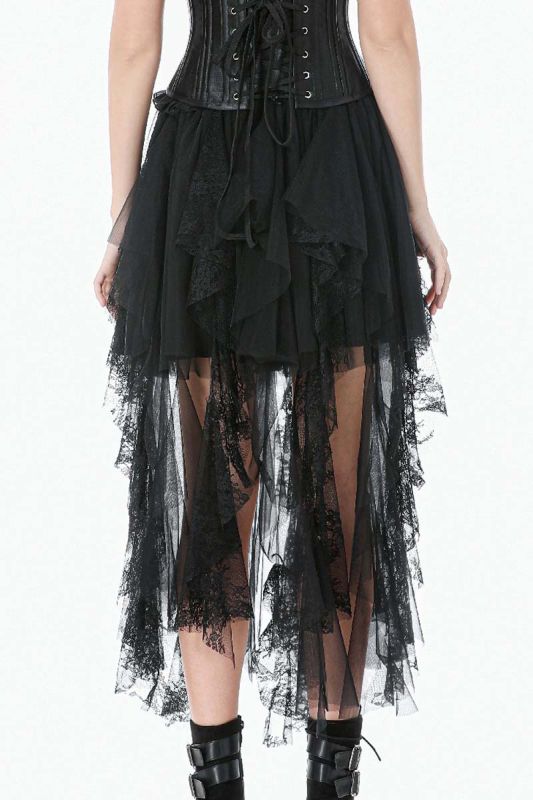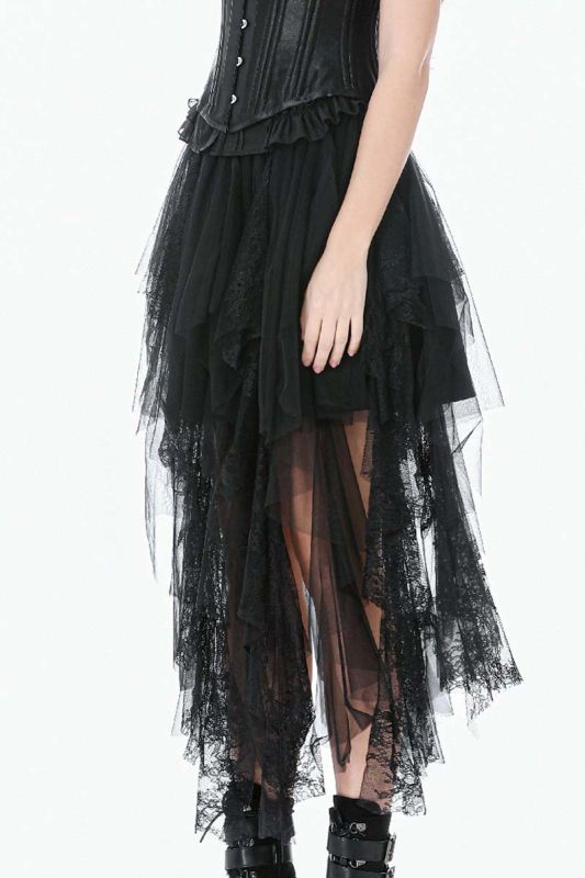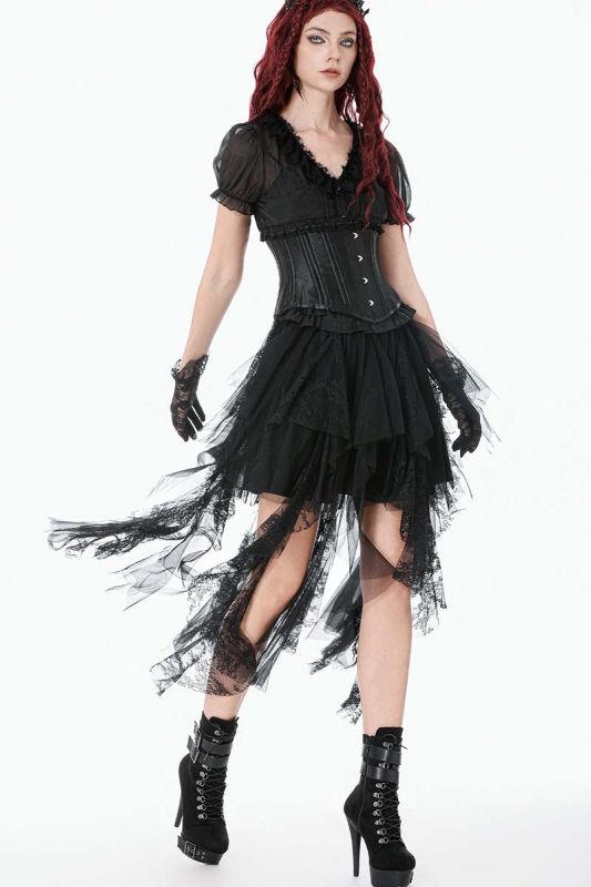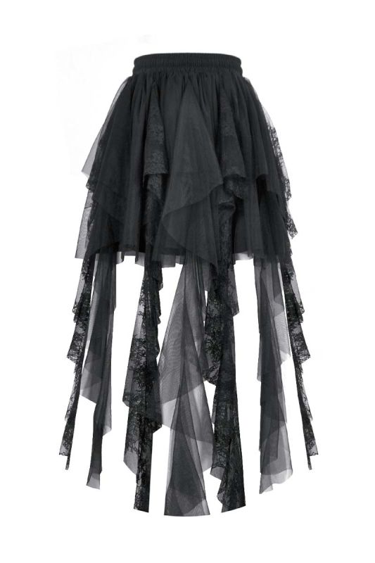 Der Ophelia Rock von Dark In Love ist ein ausdrucksstarkes Statement für Dark-Romantic- und Gothic-Couture-Looks. Mehrlagiger, transparenter Tüll trifft auf feine Spitze und eine dramatisch asymmetrische Silhouette mit langen, flatternden Stoffbahnen. Der kurze Rock wird durch verlängerte Zipfel kontrastiert und erzeugt eine eindrucksvolle Bewegung bei jedem Schritt. Der elastische Bund sorgt für hohen Tragekomfort und eine flexible Passform – ideal für besondere Anlässe, Clubnächte oder opulente Gothic-Outfits.