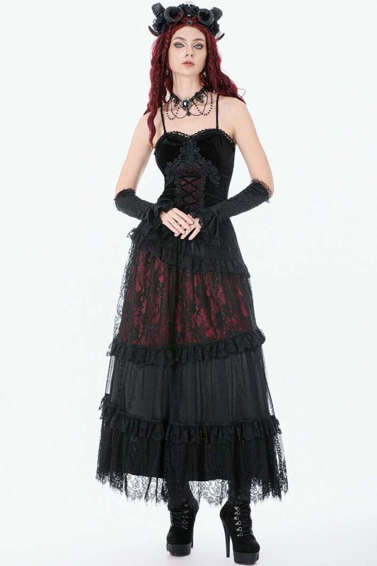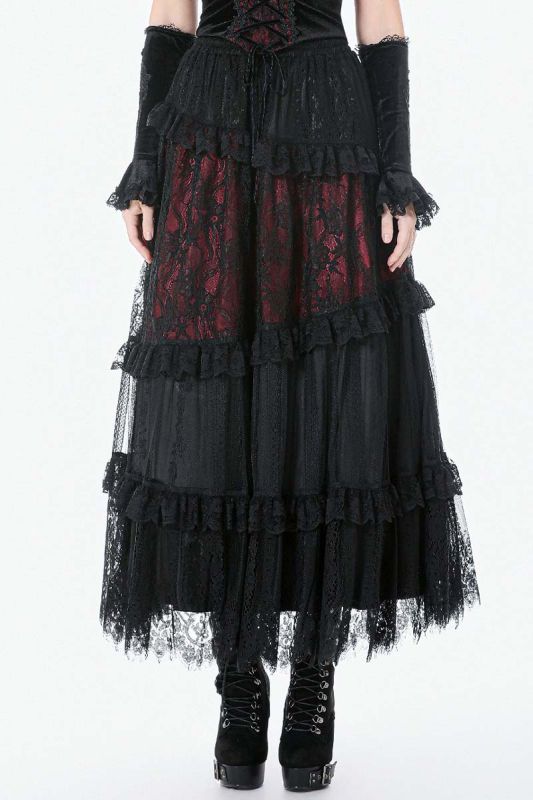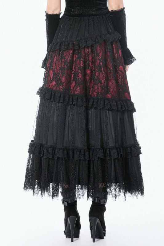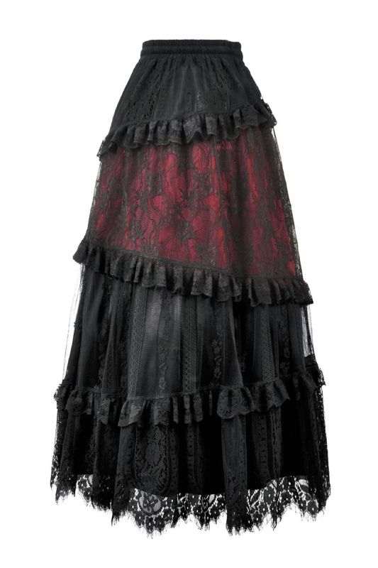 Dark In Love Rosaria Maxi Rock aus schwarzer Spitze und rotem Futter
