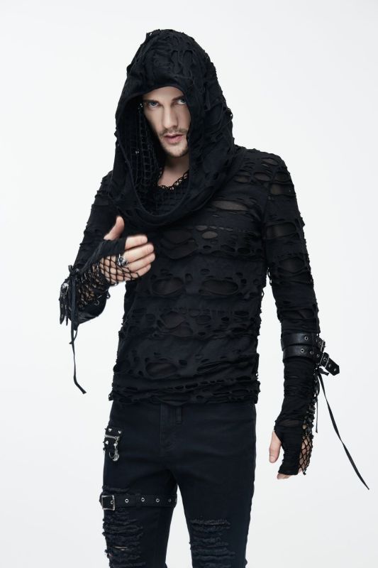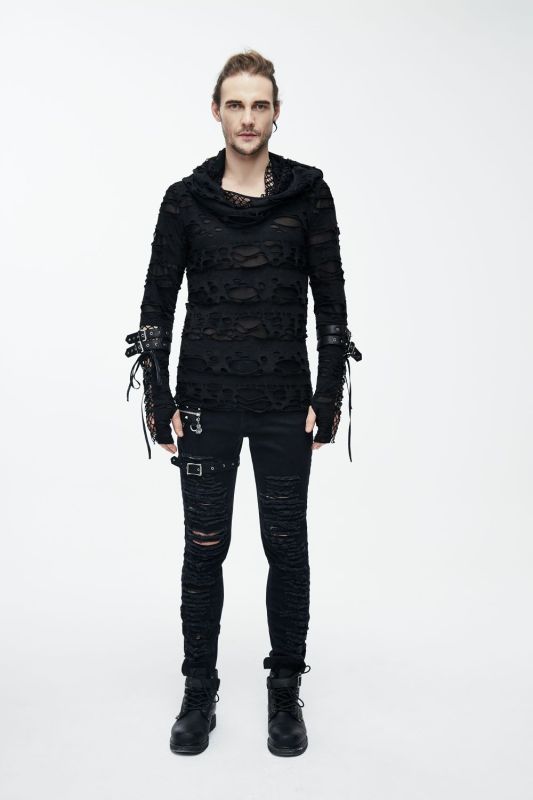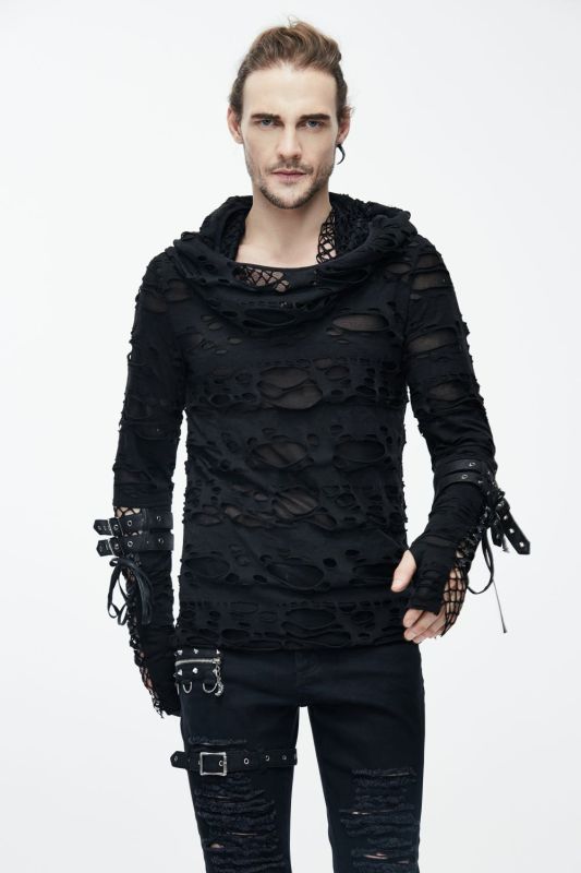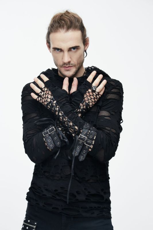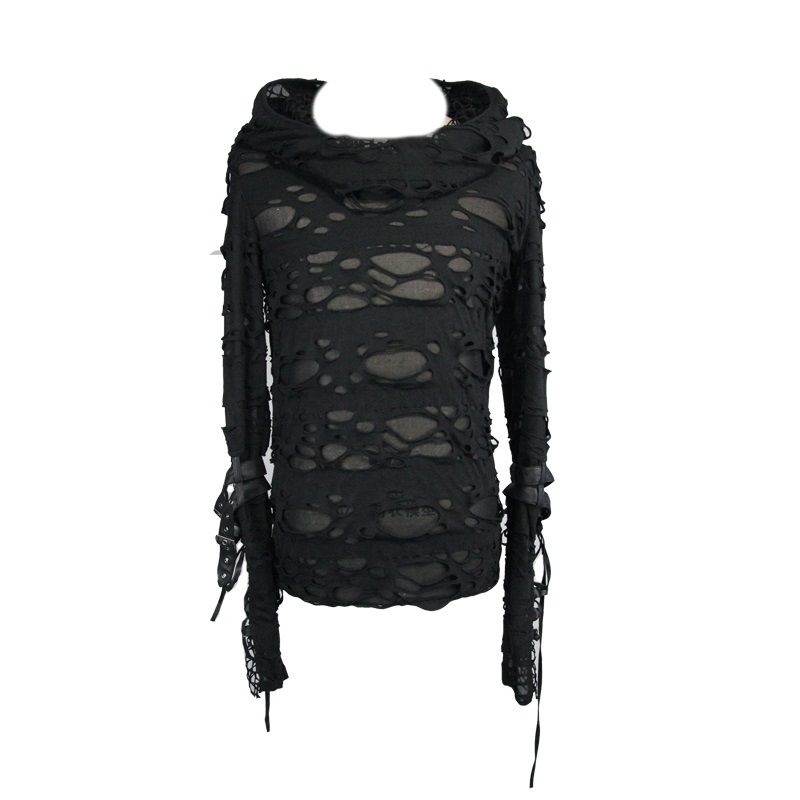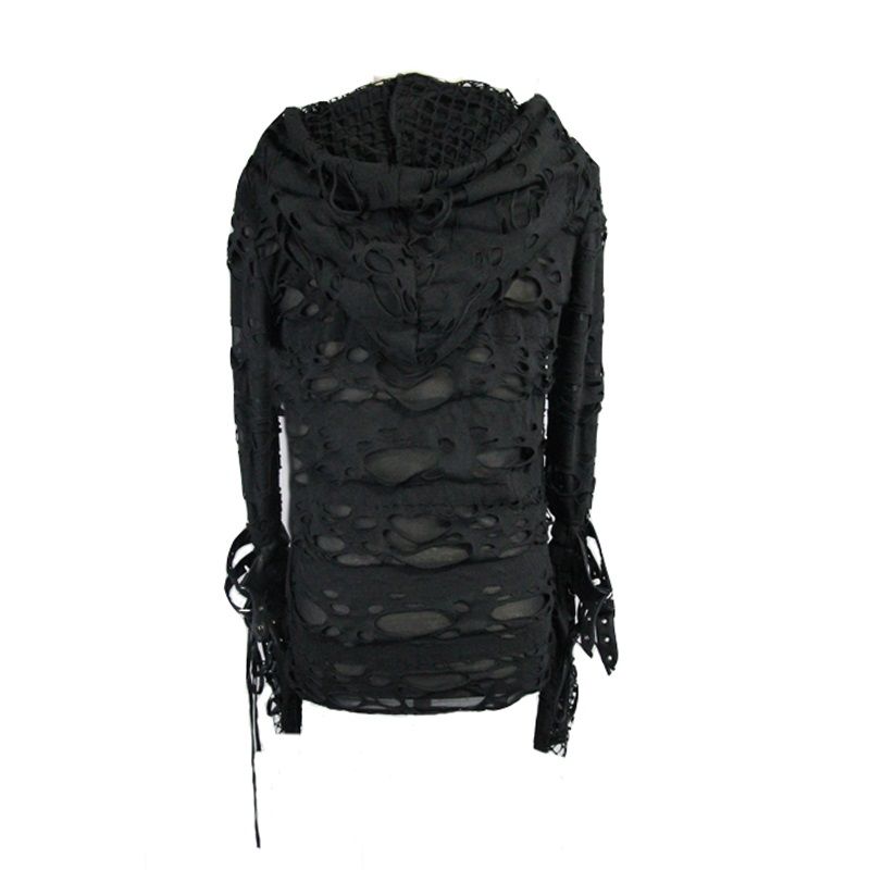 Das Devil Fashion Männer Longsleeve ist nicht nur wild und sexy, sondern auch total abgefahren und ausgefallen. Mit diesem Gothic Oberteil wirst Du alle Blicke auf Dich ziehen! Der schwarze Gothic Pullover ist auffällig durch seinen halbtransparenten Look welche mit Löchern durchzogen sind. Dein perfektes Outfit für den Destroyed Look. Komplettiert wird der Style durch eine Kapuze welche innen aus Netz ist, Lederarmbänder, sowie den langen Ärmeln die über Deine Hände reichen. Durch die Daumenlöcher kannst Du Deine Hände richtig drin verstecken. Das Gothic Longsleeve sitzt super bequem und ist enganliegend. Dieses Oberteil macht Dich zum Star auf der nächsten Party oder dem nächsten Festival. Dazu kombinierst Du am besten eine unserer Gothic Hosen, zum Beispiel eine Bondagehose. Bei den Schuhen hast Du die Wahl zwischen einem paar Boots oder vielleicht doch lieber Halbschuhe. Mit einem Accessoires kannst Du dann Dein Gothic Outfit komplett machen.