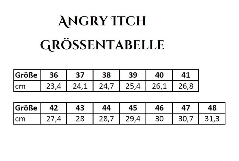 These Angry Itch boots are the perfect low shoes for anyone who wants to make a clear statement with their gothic boots. An absolute classic and a cult shoe at the same time. The Angry Itch "3 hole leather" boots are a must-have in any shoe cabinet. They impress with high wearing comfort, a dominant look and the best full-grain leather. The non-slip sole with a deep tread won't let you down, even in bad weather. Super practical if things get a little muddy at the next festival. The soft full-grain leather from which the gothic boots are made is easy to care for, pleasantly soft and very comfortable to wear. The stitched steel toe cap protects you from kicks on your night-time adventures. The inside is padded with soft material, which also makes the gothic low shoes extremely comfortable. The Angry Itch boot is also perfect for concerts and parties, because your feet are protected when you're really rocking out. The insole is washable and extremely soft. Combine an effortless style, because the gothic boots are a great basic for every day and every night. They go with any outfit and emphasise your dark lifestyle. Whether jeans, leggings, dress, Skirt, cargo trousers, cargo shorts or kilt. Meet the devil and explore the secrets of the night with him in these black gothic boots.