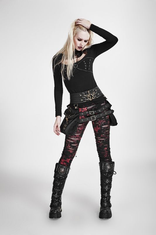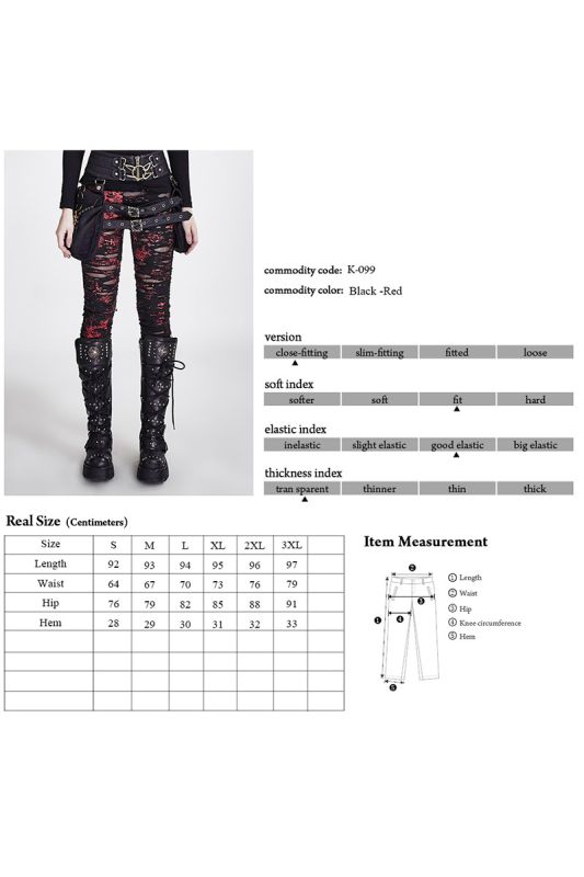 With these sexy punk rave leggings you can relax and wait for the end times, because you are perfectly dressed. Team up with your demons because they won't hesitate to attack. Be ready to experience wild adventures and rule the night in the Punk Rave "The Earth Trembles Red" leggings. They are very comfortable to wear and have an eye-catching style that will make you an eye-catcher. The wide and elastic waistband of the gothic leggings ensures the perfect fit on your daily journeys. The sexy highlight of the Punk Rave leggings is their apocalyptic red/black look. They are adorned with a print of scratches and crosses, which create a unique contrast with the frayed and torn holes. The holes in the seductive destryoed look are backed with fine, transparent mesh, for a dark atmosphere. The figure-hugging cut ensures a provocative silhouette. Combine them with everything your black heart desires for exciting outfits. The Punk Rave leggings are ideal for adding a little magic to your everyday life. Whether it's a picnic with the devil or the next concert, the black gothic leggings always fit the bill. With platform boots, mini skirts and dresses, a sexy crop top, casual shirt and eye-catching gothic jewellery, you will look stunningly good.