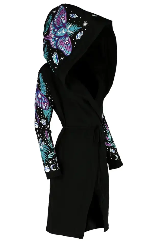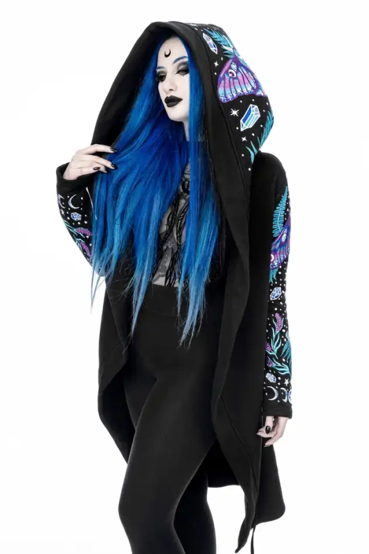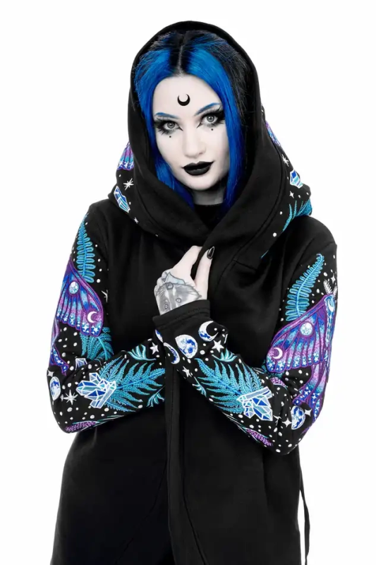 The Restyle Gothic hoodie Enchanted Forest takes you into a mystical world of nocturnal nature magic and occult symbolism. Detailed embroidery of moths, ferns, crystals, crescent moons and stars in shimmering shades of blue, turquoise and purple unfold on deep black fabric. The artistic design is reminiscent of an enchanted forest under the moonlight and gives the hoodie a mysterious, almost fairytale-like aura.