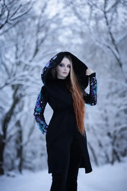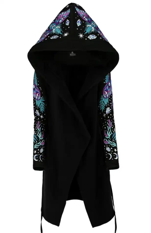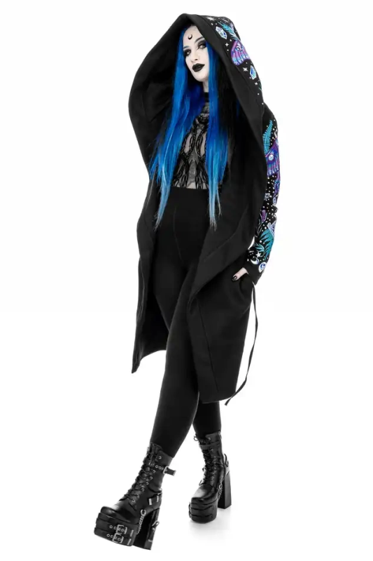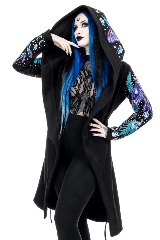 The generous, tapered hood reinforces the mystical character, while the long, open cut with a waistband creates a flowing, versatile silhouette. Ideal as a statement piece or for stylish layering in witchy and gothic looks.