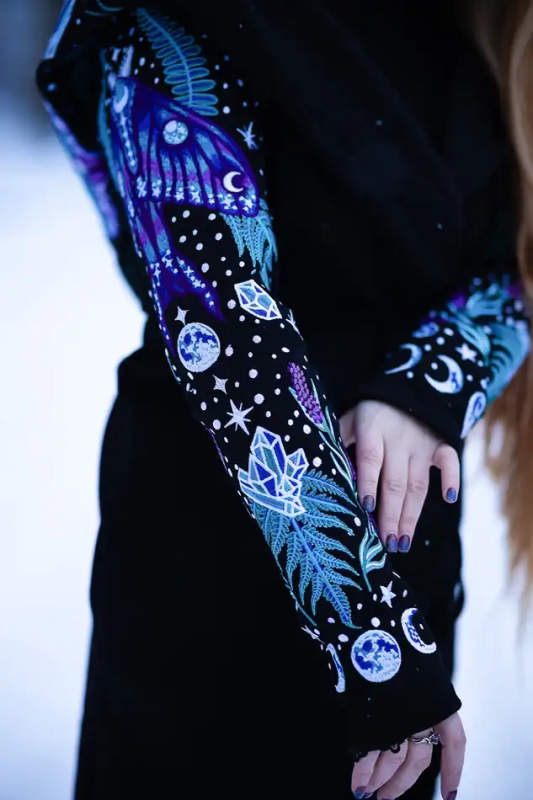 - Elaborate embroidery with moth, fern, crystal & moon symbolism