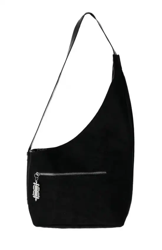 The wide, adjustable shoulder strap ensures a high level of comfort, while the soft hobo shape offers plenty of space for your essentials. Subtle metal accents and clean lines make this bag the ideal companion for modern gothic and darkwear looks.