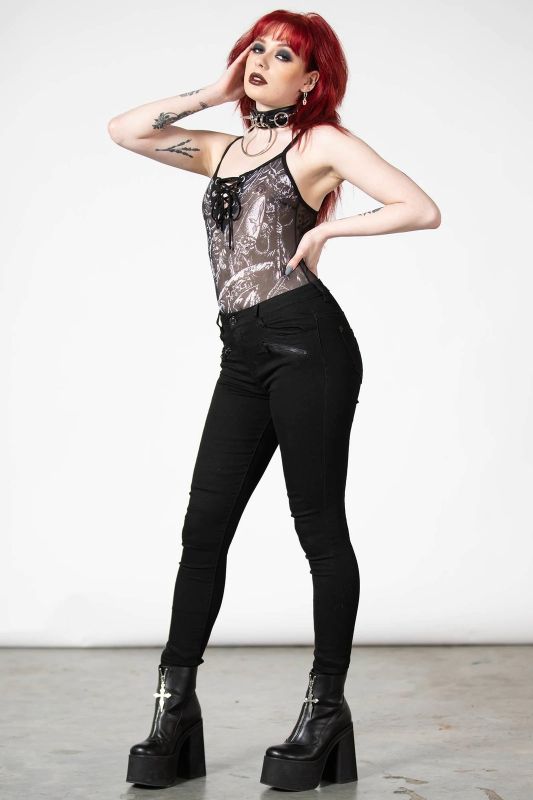 Killstar Violenta Lace-Up Body im sexy Style aus transparentem Mesh mit Dämonen-Motiv und Schnürung