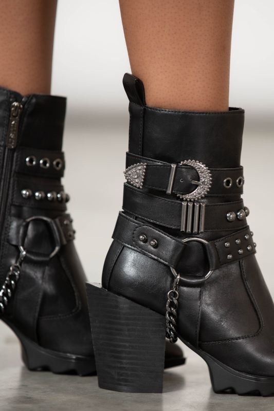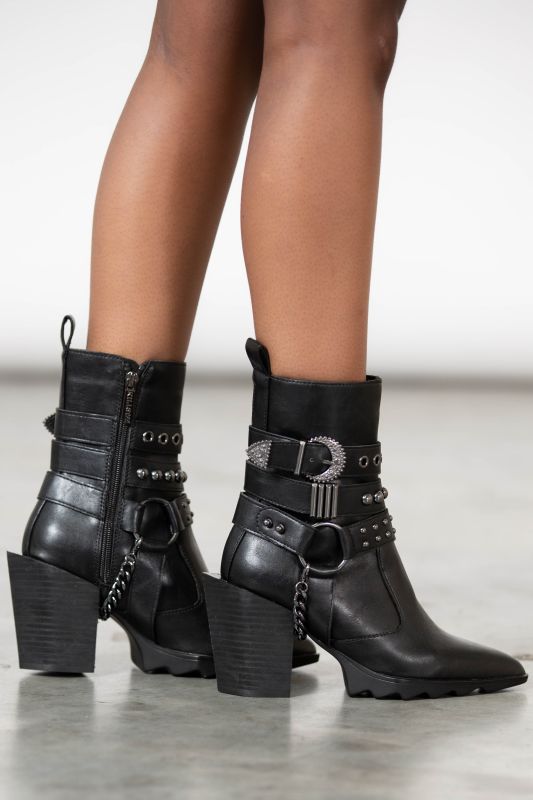 Killstar Onyx Boots mit spitz abstehendem Blockabsatz und sexy Riemen mit Kette im witchy Style