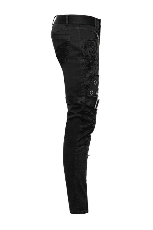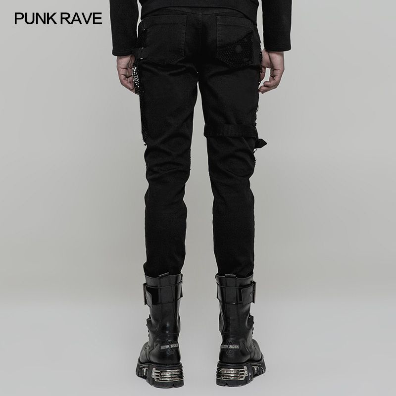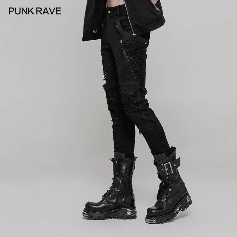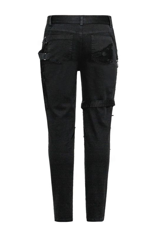 Punk Rave Ghoul Jeans im sexy used Look mit zerfetzten Netz Details und Ösen im Gothic Style