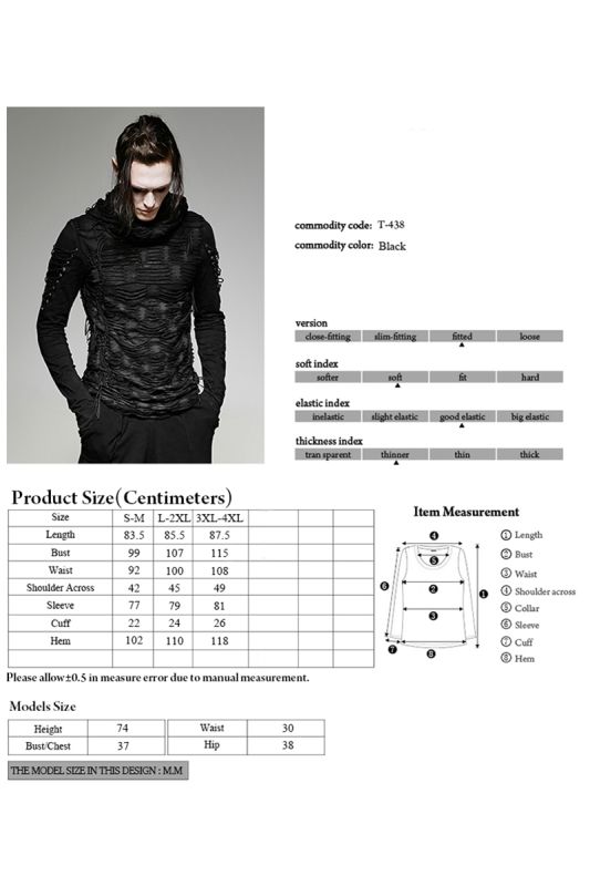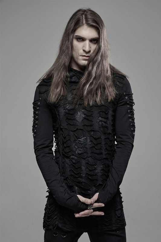 Dieses Punk Rave Longsleeve, lässt dich in einem mystischen, geheimnisvollen Licht erstrahlen und unterstreicht deinen düsteren Charakter. Erschaffen aus der Dunkelheit und hier um dich zum Blickfang zu machen ist das Punk Rave "Mystery Men" Longsleeve ein absolutes Must Have für deinen postapokalyptischen Look. Der super lässige destroyed Look verleiht dem Gothic Longsleeve seinen düsteren Charakter. Die Vor und Rückseite des Langarmshirts sind aus dem zerrissenem Material designt. Für den ultimativ dunklen Style sorgt die oversized Kapuze, die direkt am großen und weiten Kragen anschließt. Die Kapuze, lässt das Gothic Longsleeve mystisch erscheinen, weil sie auch im destroyed Look erschaffen ist. Sexy Schnürungen an den Ärmeln schaffen einen rockigen Kontrast und betonen deinen maskulinen Look. Die Schnürungen fallen durch die silberfarbenen Ösen besonders aus. Kreiere einen einzigartigen Look und werde eins mit der Finsternis. Passt zu allem was dein schwarzes Herz sich wünscht und sieht gut aus zu Jeans, Bondagehose und lässigen Boots oder hohen Stiefeln.