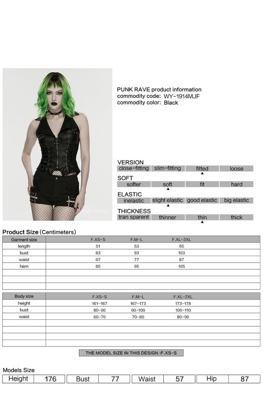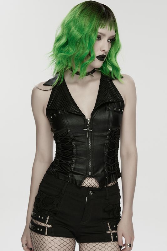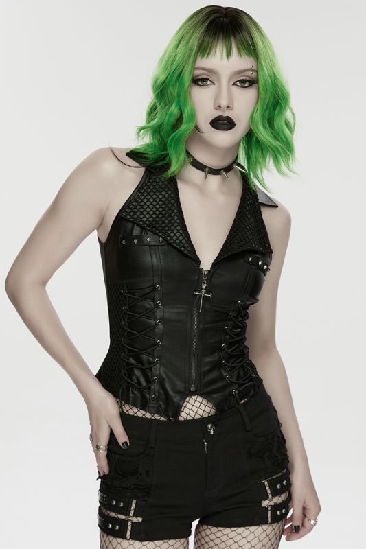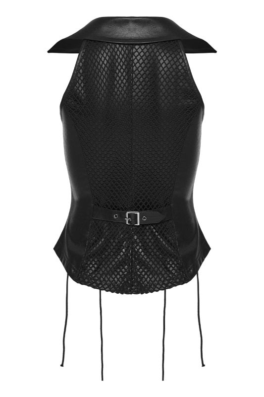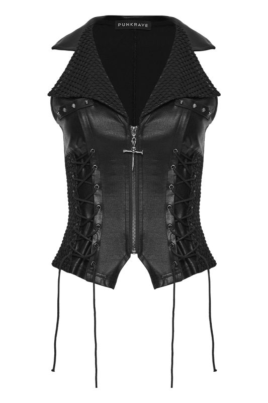 Das breite Revers mit dem tiefen V-Ausschnitt verleiht der Weste eine dominante Präsenz, während die seitlichen Schnürungen eine individuelle Anpassung ermöglichen und die Taille effektvoll formen. Der durchgehende Frontreißverschluss mit dekorativem Kreuz-Anhänger und die Totenkopfnieten setzen ein starkes, symbolträchtiges Statement. Die strukturierte Rückenpartie mit verstellbarem Riegel rundet das Design funktional wie ästhetisch ab.