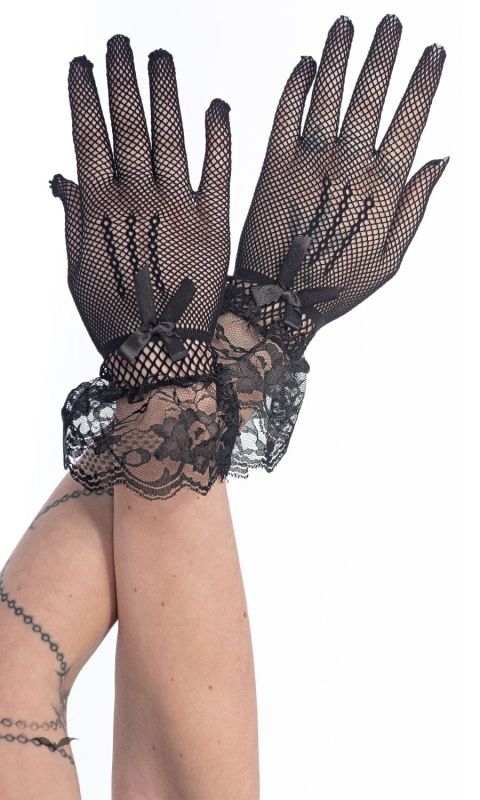 Queen of Darkness Elegant Net Handschuhe - Gothic Netz Handschuhe mit Rüschen aus Spitze und Satin Schleife