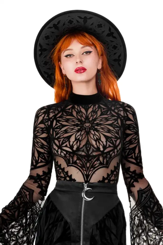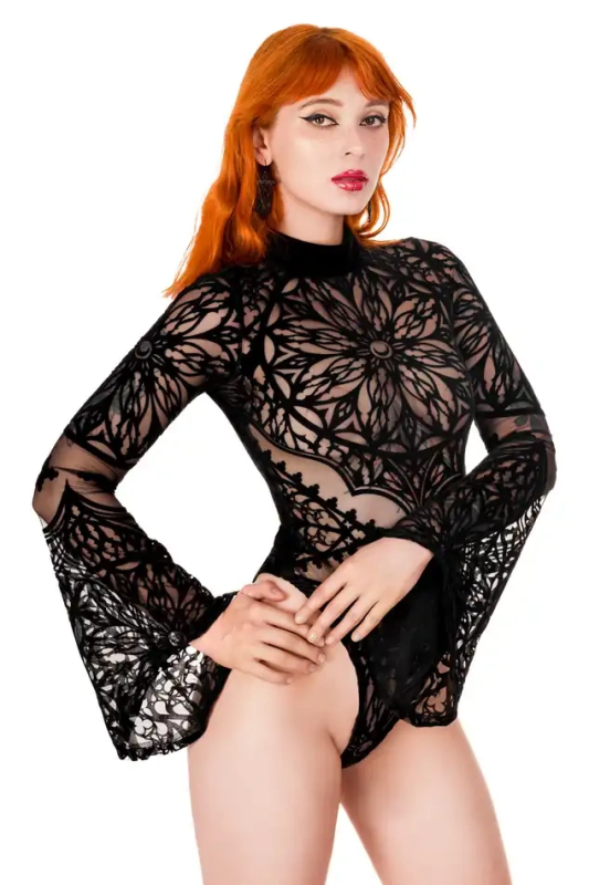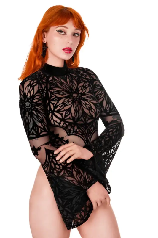 Der Restyle Gothic Body Rosarium verbindet kunstvolle Ornamente mit sinnlicher Eleganz. Das transparente Mesh wird von einem aufwendig gearbeiteten Rosetten- und Maßwerk-Muster durchzogen, das an gotische Kirchenfenster und sakrale Symbolik erinnert. Der hohe Kragen verleiht dem Design eine klare, fast klerikale Linie und bildet einen spannenden Kontrast zur körpernahen, verführerischen Silhouette.