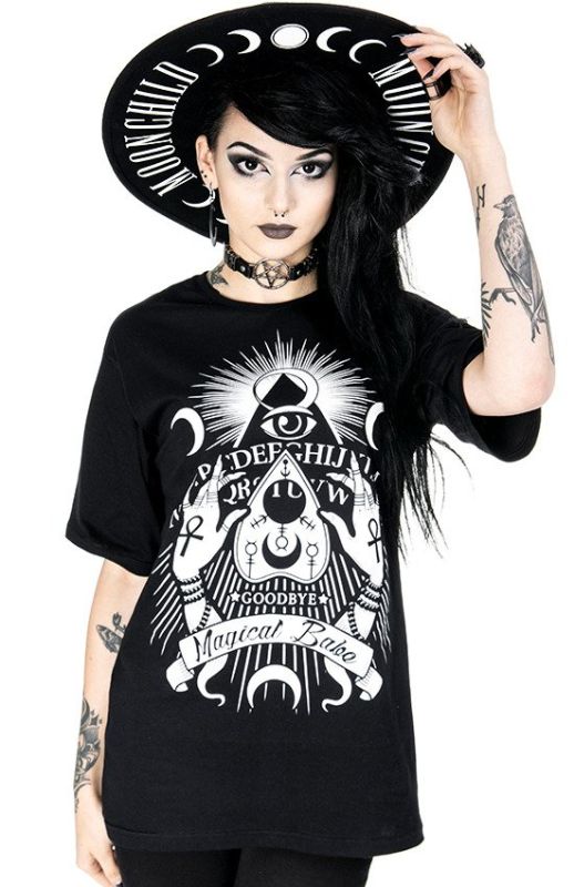 Dieser Restyle Hut ist einfach perfekt für deinen magischen Lifestyle. Eine übernatürliche Komposition aus 100% reiner Wolle und einem grandiosen Design. So besticht der Restyle "Moon Child" Hut mit okkulten Mondphasen Symbolen und einen wundervollem Schriftzug. In großen Lettern steht gleich zweimal der "MOONCHILD" Spruch auf der breiten Kempe. Der weiße Grafik Print habt sich von der schwarzen Wolle super ab. Ein cooles Statement, das deiner Erscheinung eine zauberhafte Aura verleiht. Das Material ist fest gewebt und verleiht dem Gothic Hut eine robuste und unsterbliche Form. Die Krempe rahmt deinen Kopf schön ein und hat mit 10cm die perfekte Breite. Das stilechte Gothic Accessoire ist ein cooler Blickfang, der für jede Jahreszeit geeignet ist. Ob im Sommer, als Schutz vor der Sonne oder im Winter, um die Kälte zu vertreiben. Der Hexen Hut ist ein treuer Begleiter, der deine düsteren und mystischen Outfits auf das nächste Level bringt. Mit einer heißen Leggings, Plateau Boots und einem sexy Top, beschwörst du den Style einer modernen Hexe.