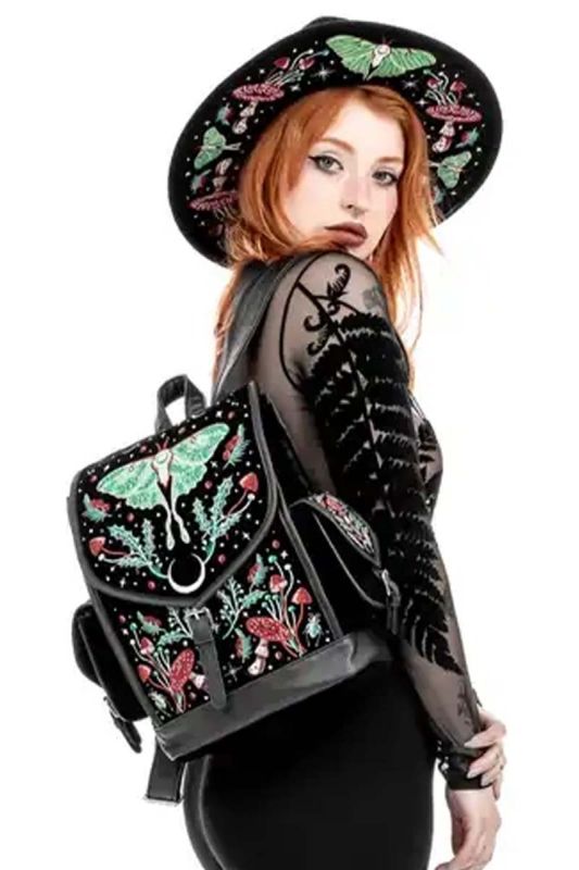 Mystische Symbolik und herbstliche Naturmotive treffen im Restyle Gothic Rucksack Autumnal Equinox aufeinander und formen ein außergewöhnliches Statement-Piece. Auf tiefschwarzem Grund entfaltet sich eine detailreiche Stickerei aus Motte, Fliegenpilzen, Pflanzenranken, Mondsichel und Sternen. Die kontrastreichen Grün-, Rot- und Cremetöne erzeugen eine geheimnisvolle, fast alchemistische Aura und erinnern an den Übergang zwischen Licht und Dunkelheit.