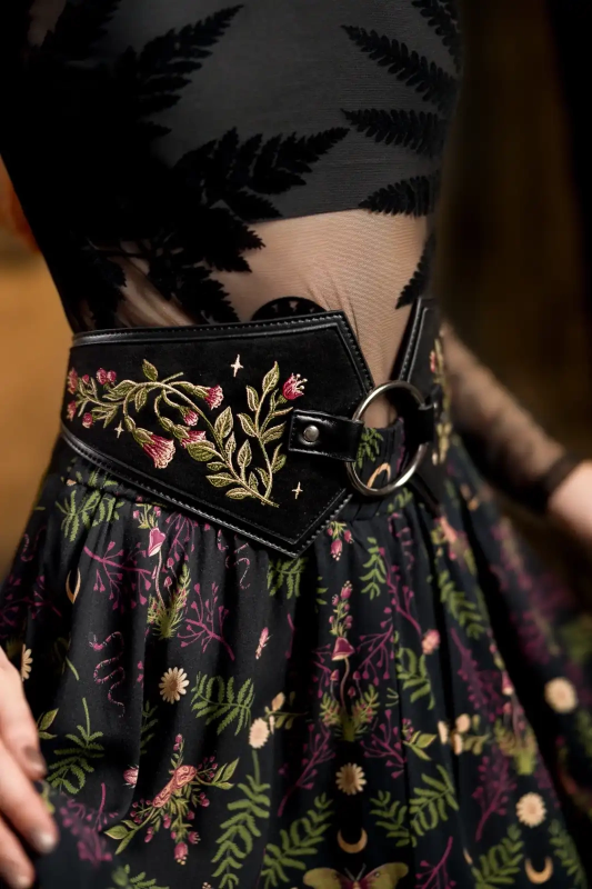 Dieser ausdrucksstarke Taillengürtel von Restyle verbindet dunkle Eleganz mit subtiler Romantik. Das samtige Schwarz bildet die perfekte Bühne für die detailreiche florale Stickerei, während der markante O-Ring in der Front dem Design eine moderne, leicht rebellische Note verleiht. Ideal, um Kleider, Tuniken oder Mäntel stilvoll zu akzentuieren und die Taille wirkungsvoll in Szene zu setzen.