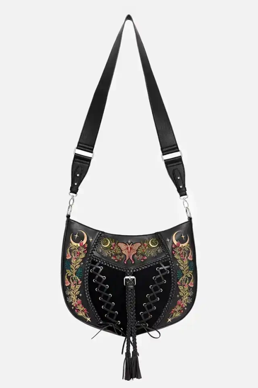 Geflochtene Zierelemente, dekorative Schnürungen und ein mittiger Riemen mit Quasten setzen starke Akzente und erinnern an Korsagen-Ästhetik. Der breite Schulterriemen sorgt für hohen Tragekomfort und macht die Tasche alltagstauglich – ob für Konzerte, Festivals oder urbane Darkwear-Outfits.